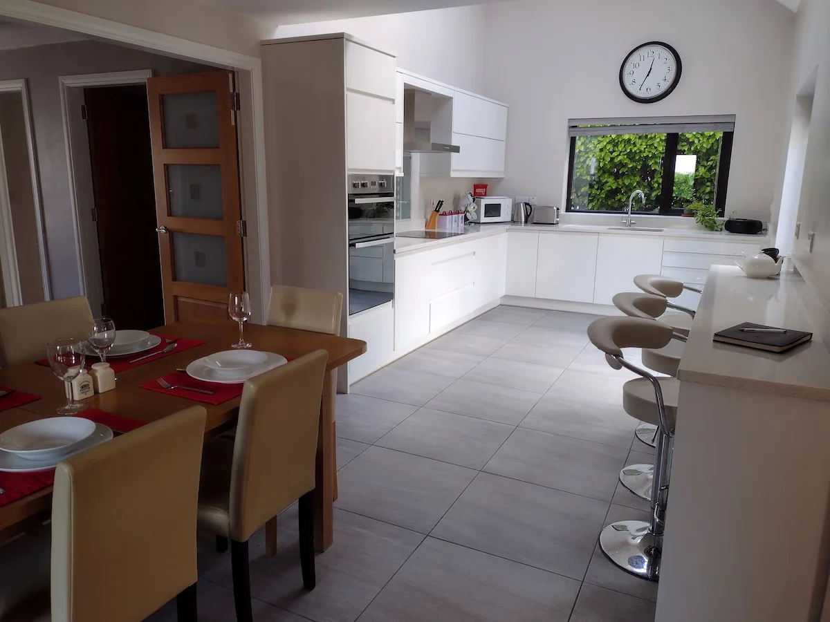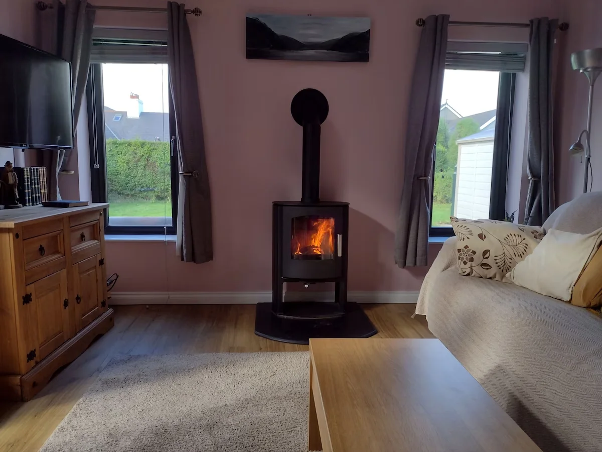Located in the heart of Newcastle and just a short walk from the town’s main street, shops, and seaside promenade, this beautifully presented two-bedroom, two-bathroom detached bungalow offers a stylish and mobility-friendly retreat for up to four guests. Set entirely on one level, the property provides full step-free access throughout, making it an excellent choice for guests with limited mobility or those who simply prefer easy, barrier-free living. Inside, the bright and spacious layout includes an open-plan kitchen and dining area, fully equipped with a dishwasher, washing machine, and dryer for convenience. The separate living room offers a comfortable space to unwind, with patio doors leading directly to the enclosed rear garden. Both bedrooms feature double beds and built-in wardrobes, while the master bedroom includes its own en-suite wet room with a modern walk-in shower. An additional wet room, also step-free, ensures practicality and comfort for all guests. Ideal for families, the property provides a travel cot and high chair at no extra charge. A fold-out bed is available for children up to age 12 (£10 per night), and an adult fold-out bed can be set up in the living room on request (£20 per night). Dogs are welcome by arrangement, and pet amenities such as bowls and a dog bed can be provided. Outside, the enclosed garden and private patio offer a peaceful place to enjoy the stunning views of the Mourne Mountains, complete with outdoor furniture and a charcoal BBQ for al fresco dining. Private and secure on-site parking adds peace of mind, while the quiet residential setting ensures a relaxing stay. With high-speed Wi-Fi, a Smart TV, mountain views, and close proximity to the beauty of the Mournes and the attractions of Newcastle, this mobility-friendly bungalow is the perfect accessible getaway for couples, families, and anyone seeking comfort, convenience, and coastal charm.