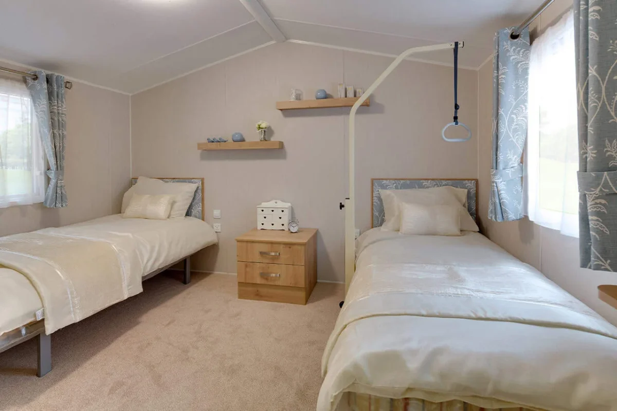 The master bedroom offers generous floor space, with room on both sides of the bed and a mobile trapeze lifting bar to support transfers and mobility needs. The accessible wet room is designed for safety and practicality, including a wheel-in shower, fold-down seat, wheel-under wash basin, and grab rails beside the toilet and sink. The combination of comfort and functionality ensures every guest can enjoy their stay with confidence.