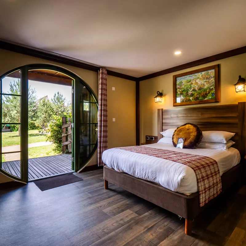 The Alton Towers Enchanted Village Accessible Lodges offer a magical and inclusive woodland retreat in the heart of the Alton Towers Resort, Stoke-on-Trent. These beautifully designed wheelchair friendly lodges combine fairy-tale charm with modern accessibility, creating the perfect getaway for families, couples, and friends seeking a unique and relaxing stay near one of the UK’s most popular attractions. Each accessible lodge features a single-storey layout with level access, widened doorways, and lowered fixtures to ensure comfort for guests with mobility needs. The ensuite wet room includes a step-free shower, handrails, wheel-under wash basin, and transfer space, offering safety and convenience throughout your stay. Assistance dogs are welcome, and vibrating emergency alarms are available for added peace of mind. Guests can unwind on private patios or explore the wheelchair accessible pathways that meander through the Enchanted Village’s lush woodland setting. Themed storytelling sessions, play areas, and character encounters make this an unforgettable experience for all ages. Dining is a delight, with cosy cafés and woodland-themed restaurants serving hearty meals and family-friendly dishes. With on-site parking, accessible public areas, and proximity to the Alton Towers Theme Park, these lodges offer the perfect balance of relaxation and adventure. Whether you’re enjoying the tranquil forest surroundings or a thrilling day at the park, the Enchanted Village Accessible Lodges deliver a truly inclusive and memorable stay for every guest.