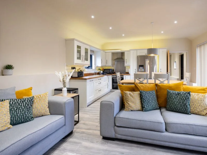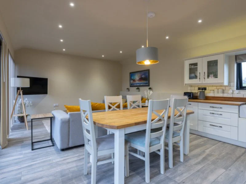 The living room features level access to the kitchen area, making it easy to navigate between spaces. There is plenty of seating available, and the dining table is high enough to accommodate a wheelchair underneath, ensuring a comfortable dining experience.