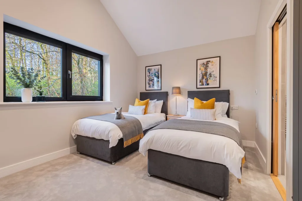 Beech Rock offers flexible accommodation across five beautifully designed bedrooms. On the ground floor, a double room features a non-profiling bed and an ensuite shower room with a step-free shower, ensuring comfort for guests with mobility needs. Upstairs, there are three double bedrooms and one twin, each with bi-sprung mattresses and generous floor space. Four bedrooms include ensuite bathrooms, and three feature French doors opening to garden or woodland views, creating a calm, airy feel throughout.