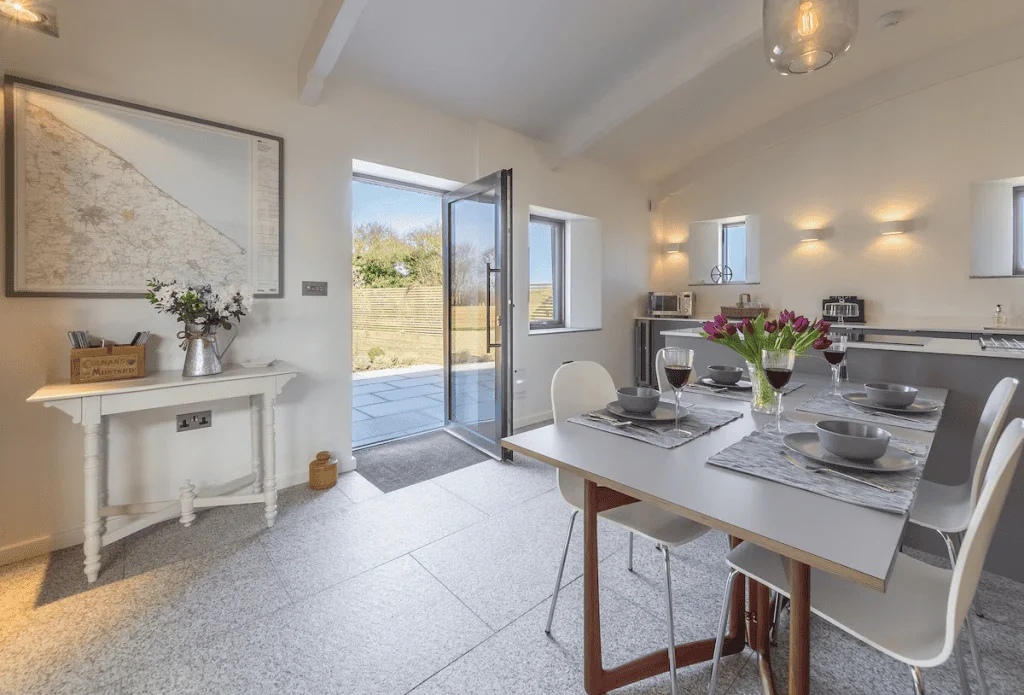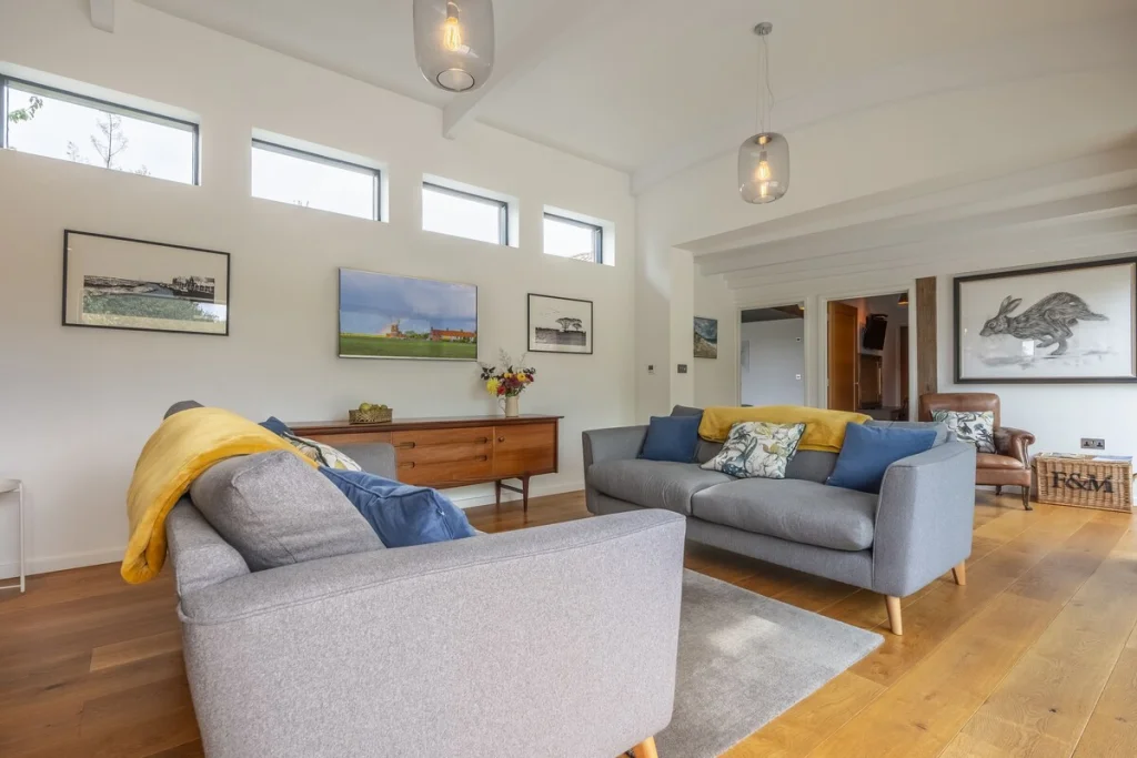 Set entirely on one level, Big Sky Barn features a bright and spacious open-plan living area. The fully equipped kitchen offers everything needed for home cooking, and the dining area comfortably seats four, making it ideal for family meals or relaxed evenings in. In the sitting area, large French doors open to the courtyard garden, filling the space with natural light. Guests can unwind on the plush sofas and enjoy entertainment on Netflix or Sky TV, surrounded by the barn’s characterful exposed brick and timber detailing.
