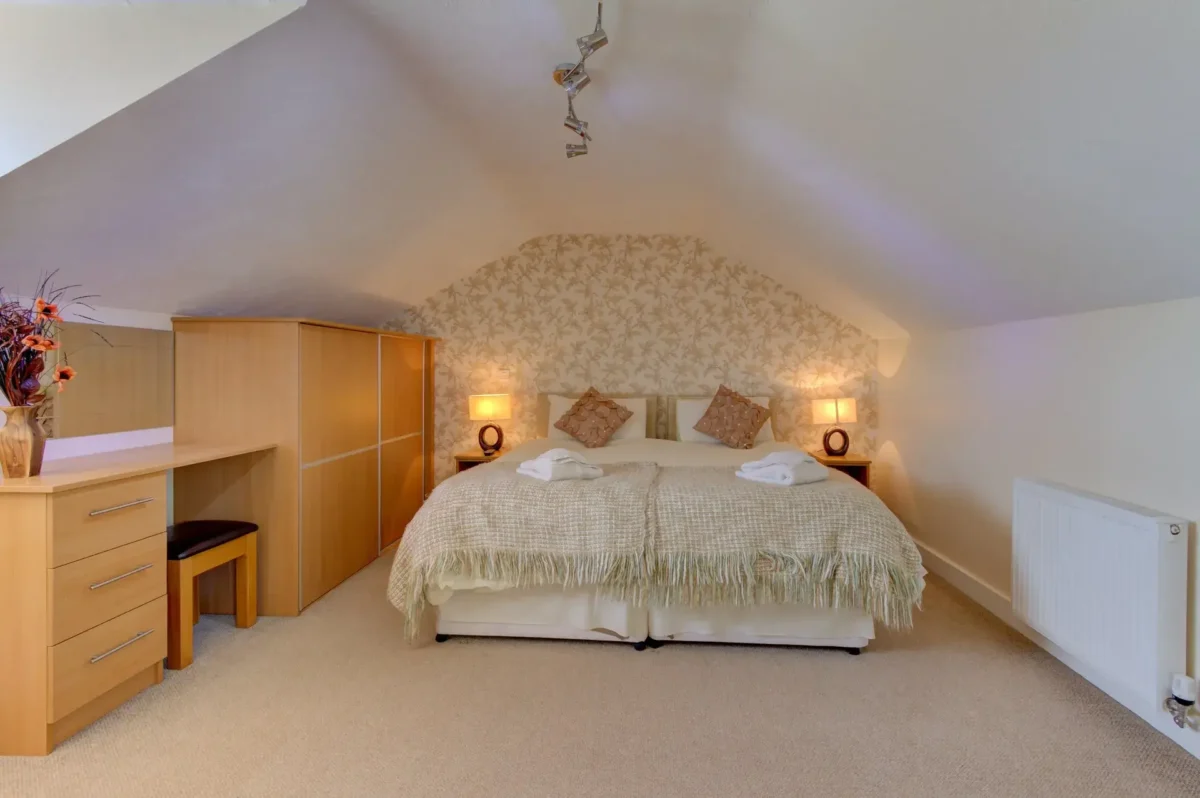 Upstairs, guests will find a stylish and comfortable bedroom with twin or double beds and an en suite shower bath, offering flexibility and privacy. The light, airy design ensures a restful space for all, whether relaxing after a countryside walk or preparing for a day of exploring nearby attractions.