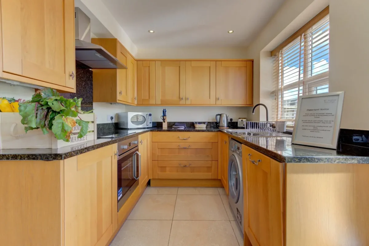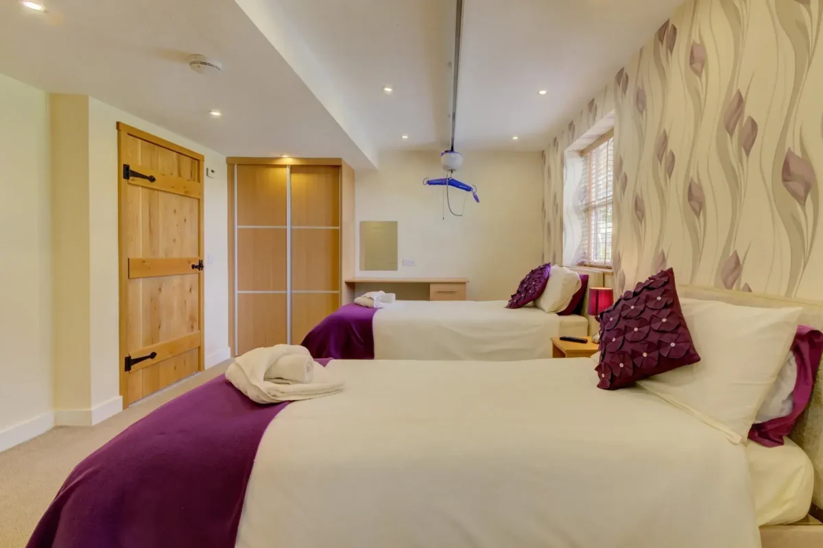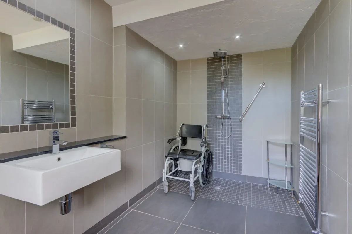 On the ground floor, the accessible bedroom is thoughtfully designed to meet a variety of mobility needs. It features electric profiling beds and a ceiling track hoist connecting directly to the sink and accessible wet room. The en suite wet room includes grab rails, a wall-mounted changing bed, and a shower chair, ensuring safety, ease, and independence for every guest. The living area offers an open-plan layout, providing seamless level access throughout to the kitchen, dining space, and outdoor patio, making it easy to move freely and enjoy the beautiful surroundings.