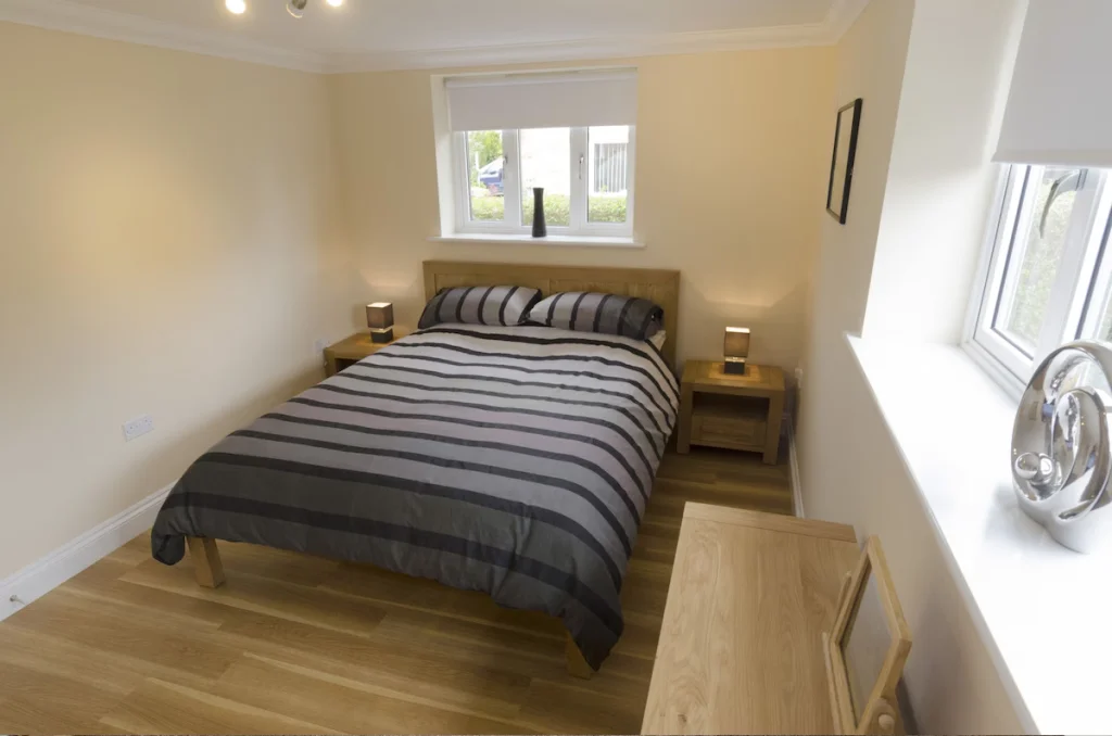 Brightside Cottage offers four comfortable bedrooms, ideal for both relaxation and practicality. On the ground floor, an accessible double bedroom provides generous space for mobility aids, while the wet room features a roll-in shower, handheld shower attachment, lever-style taps, and a toilet with side transfer space, ensuring a seamless experience for wheelchair users. Upstairs, three additional bedrooms include one double room with an en suite shower and two twin rooms, each thoughtfully designed for comfort and flexibility.
