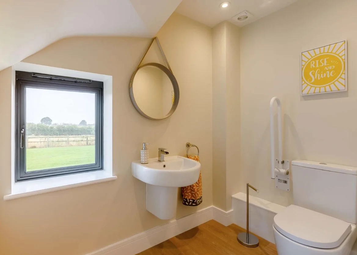 The ground floor welcomes you with a bright, open-plan living area, furnished with two elegant sofas, a Smart TV, and wide sliding doors that open onto a private patio with breathtaking countryside views. The modern kitchen is fully equipped for accessibility, featuring a lowered sink, wheel-under oven, and a spacious dining area with freestanding seating. A convenient cloakroom WC is also located on this level, and the internal wheelchair-accessible lift provides smooth and easy access to the upper floor.