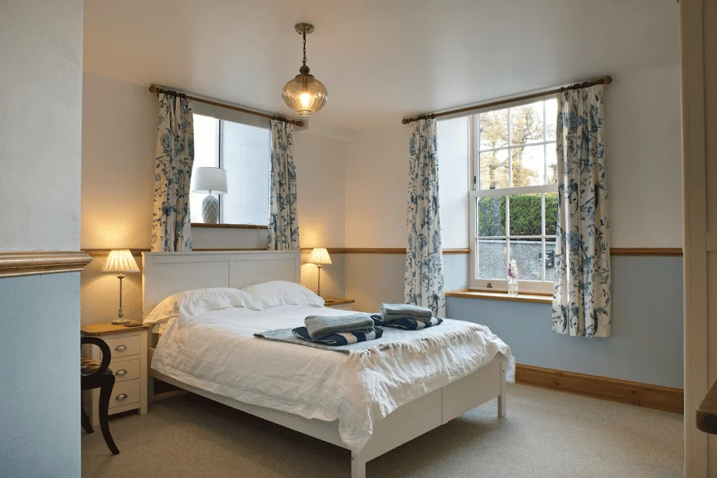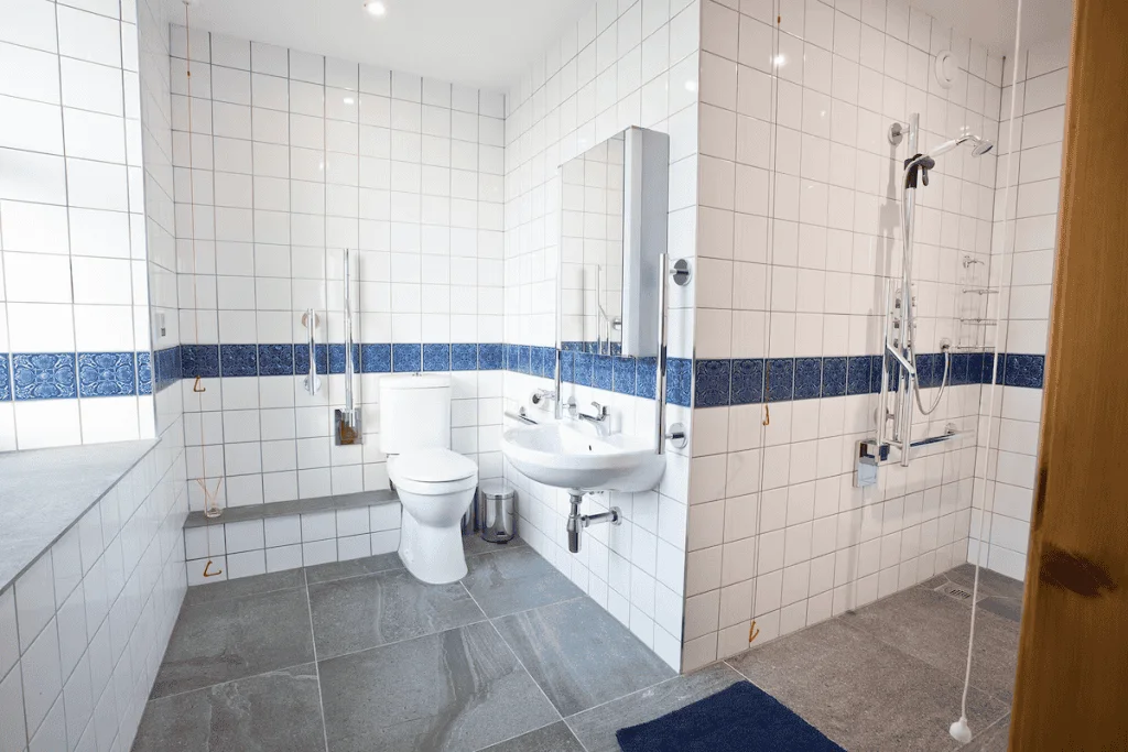 Two ground-floor bedrooms offer exceptional comfort for guests with mobility needs. The accessible double room includes an ensuite wet room fitted with handrails, a wall-mounted shower seat, and an emergency pull-cord alarm, while the adjacent twin bedroom also benefits from its own ensuite shower room and step-free access. The remaining bedrooms, located upstairs, provide additional space and comfort for larger groups.