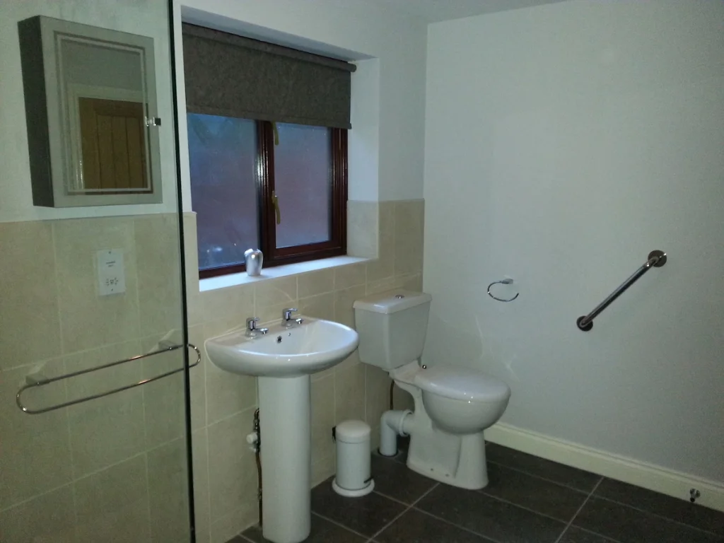 Accommodation includes three comfortable bedrooms. The ground-floor master bedroom features a non-profiling double bed with ample manoeuvring space and an en-suite accessible wet room fitted with a step-free shower, shower seat, handheld shower attachment, and support rails. Upstairs, guests will find two additional bedrooms—one double and one twin—each designed for comfort and relaxation with easy access to shared facilities.