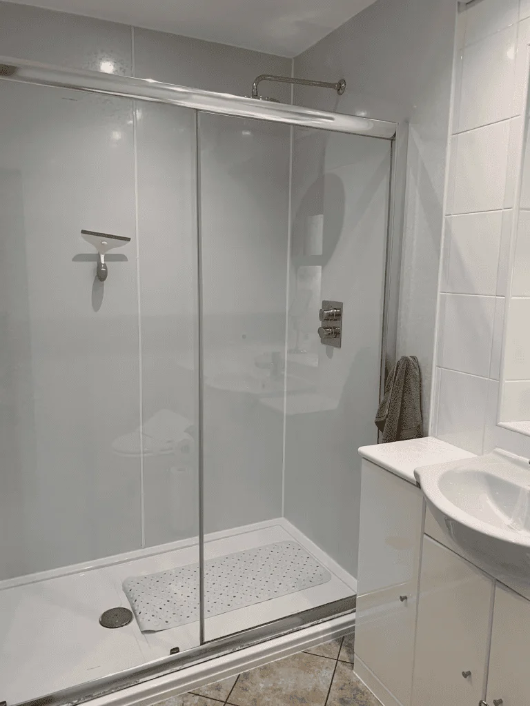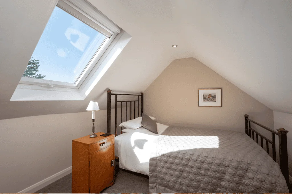 Accessibility continues throughout the ground floor, where the spacious bedroom offers a non-profiling double or twin bed with generous manoeuvring space. The accessible bathroom features a step-free shower, handheld shower attachment, and lever-style taps, making daily routines simpler for guests with mobility needs. Upstairs, two charming attic bedrooms with coombed ceilings are accessed via a spiral staircase, offering additional sleeping space and a touch of character.