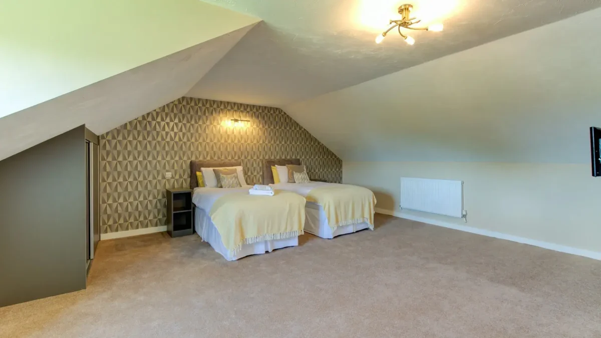 Upstairs, the second bedroom offers twin or double beds and a private en suite bathroom featuring a walk-in shower. This flexible layout makes Holly Cottage perfect for small groups or families seeking both comfort and privacy.