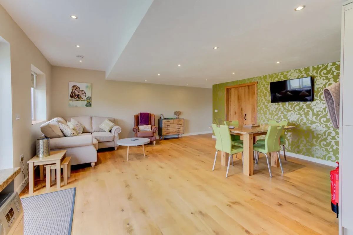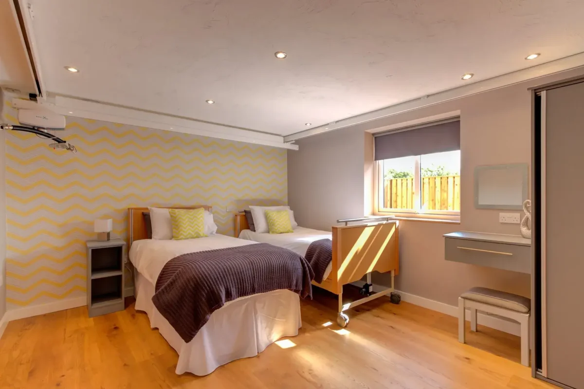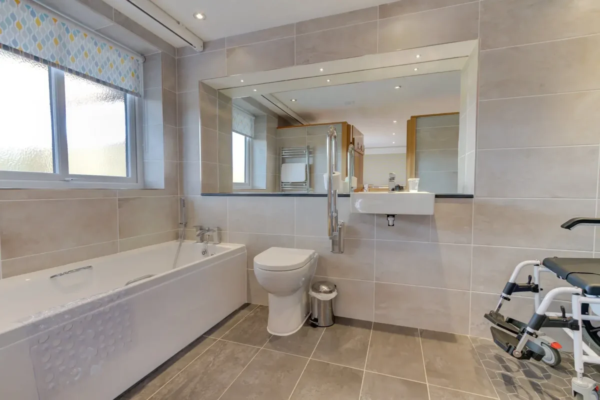 Inside, guests are welcomed into a warm and inviting living area, thoughtfully designed to provide both comfort and easy access throughout the fully accessible ground floor. The main accessible bedroom includes two electric profiling beds, ideal for guests with mobility needs. A discreet H-track ceiling hoist ensures smooth and effortless transfers between the bedroom and the adjoining wet room, which is fitted with a push-button toilet flush, grab rails, a roll-in shower, and a shower chair, providing safety, convenience, and independence.