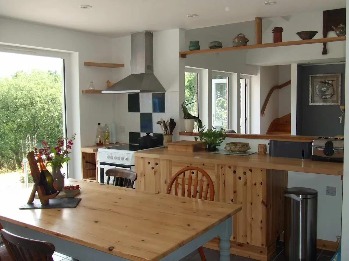 Inside, the house is warm, bright, and inviting, with underfloor heating throughout the open plan living and kitchen area creating year round comfort. The property is well suited to guests with limited mobility, offering level access and a fully accessible wet room. Three private bedrooms provide comfort and flexibility: a ground floor king size room with an en suite, a flexible twin room that can be prepared as a king, and a smaller double bedroom upstairs. A second wet room serves the remaining rooms.