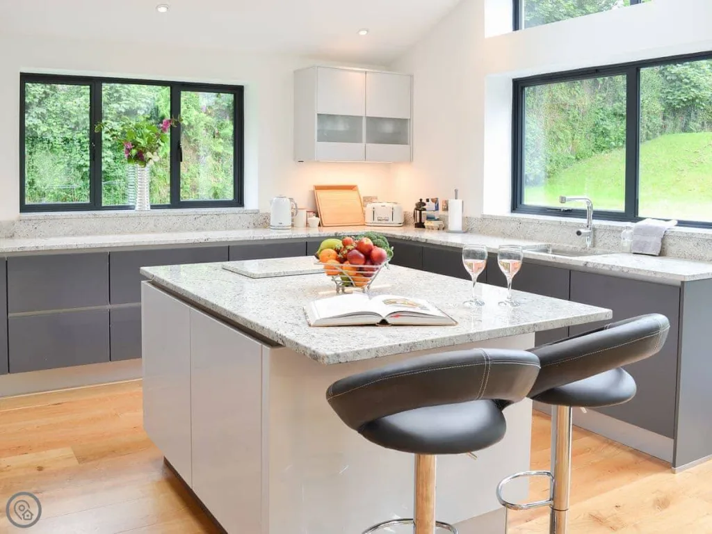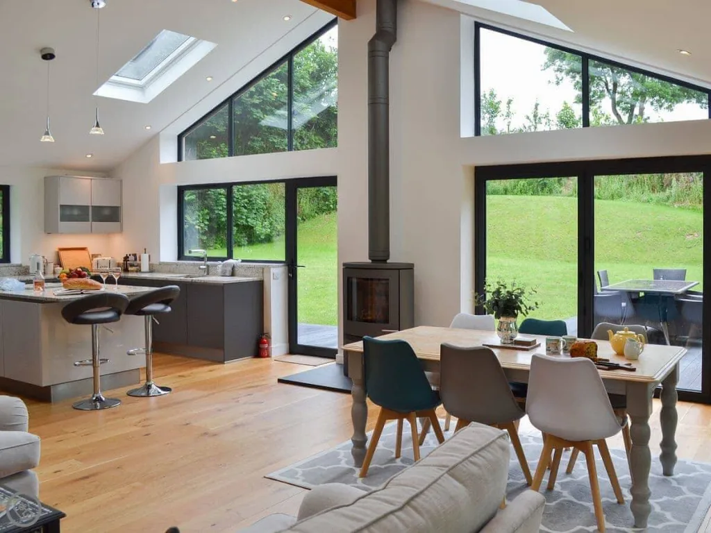 Inside, the open-plan living space offers a relaxed and inviting atmosphere, with plush seating, a modern flat-screen TV, and a cosy fireplace ideal for unwinding after a day exploring Cornwall’s coastline and countryside. The full-height bi-fold doors bathe the lounge in natural light and open directly onto a level patio, providing uninterrupted views of the peaceful brook that flows beside the lodge. The fully equipped kitchen includes high-end appliances and generous worktop space, allowing guests to prepare home-cooked meals with ease, whether enjoying a morning coffee or gathering for dinner around the stylish dining table.