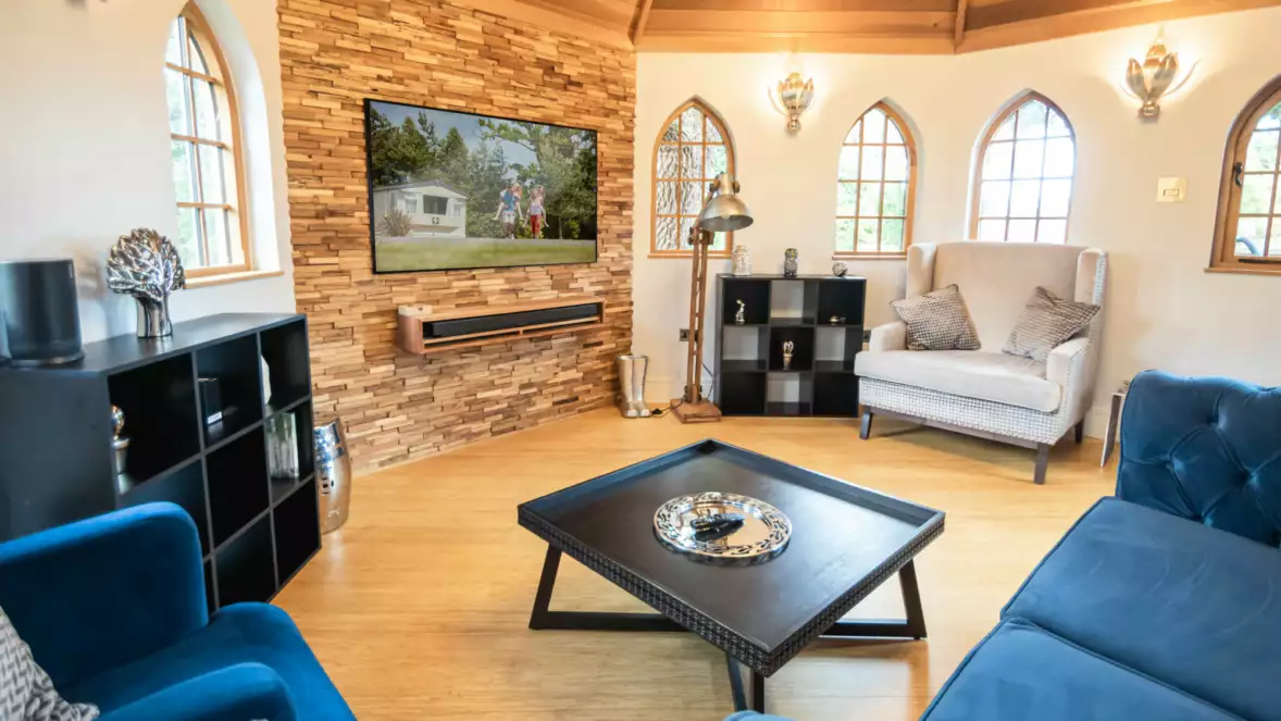 From the living space, guests can step onto the expansive decking area, which offers level access and an idyllic spot to unwind amidst the trees. The private hot tub provides an extra touch of indulgence, allowing guests to relax under the stars in a peaceful, secluded setting.