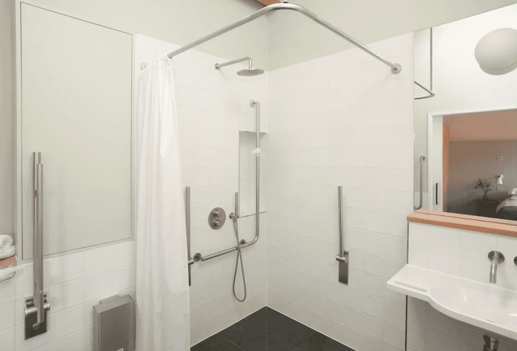 Lynchets offers two thoughtfully designed bedrooms, each ensuring maximum comfort and accessibility. The master bedroom features a 6′ super-king-size bed and an en-suite bathroom with a shower over the bath, providing a luxurious private retreat. The second bedroom includes 3′ profiling twin beds, ideal for guests with mobility needs. The large accessible wet room is fitted with an overhead and adjustable shower, wheel-under wash basin, and WC with transfer space to the side. Handrails are positioned beside the toilet and within the shower, complemented by lever-style taps and ample manoeuvring space for wheelchairs.
