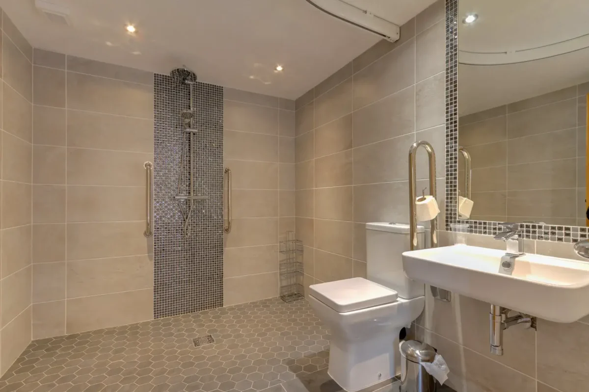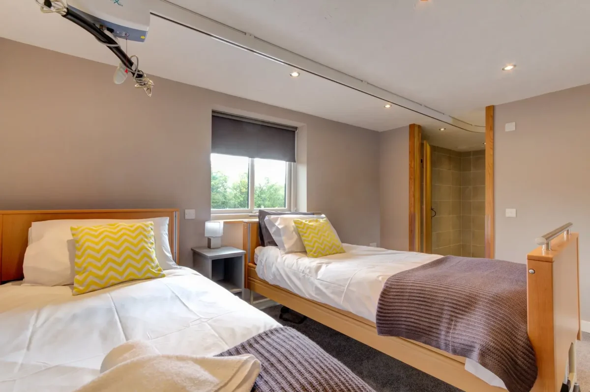 Accessibility is thoughtfully integrated throughout Maple Cottage. The ground-floor accessible bedroom includes a profiling bed and an adjacent twin, ensuring comfort for guests with mobility needs and their companions. A ceiling track hoist offers smooth transfer between the bedroom and the fully accessible wet room, which includes a roll-in shower, grab rails, and a shower chair for ease and safety. The second ground-floor bedroom provides flexible sleeping arrangements and features a walk-in bath en suite, perfect for relaxing after a day of exploring.
