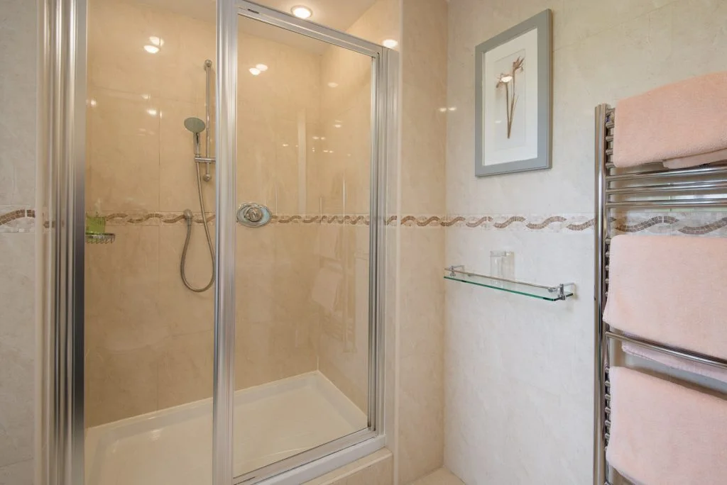 Sleeping arrangements include a spacious master bedroom with a super king size bed, TV, and en suite bathroom. The second bedroom is a generous twin. The family bathroom is fully accessible with a roll in power shower, supportive grab rails, and a bath with powered filling. Guests can request a shower wheelchair or bath seat for additional comfort.