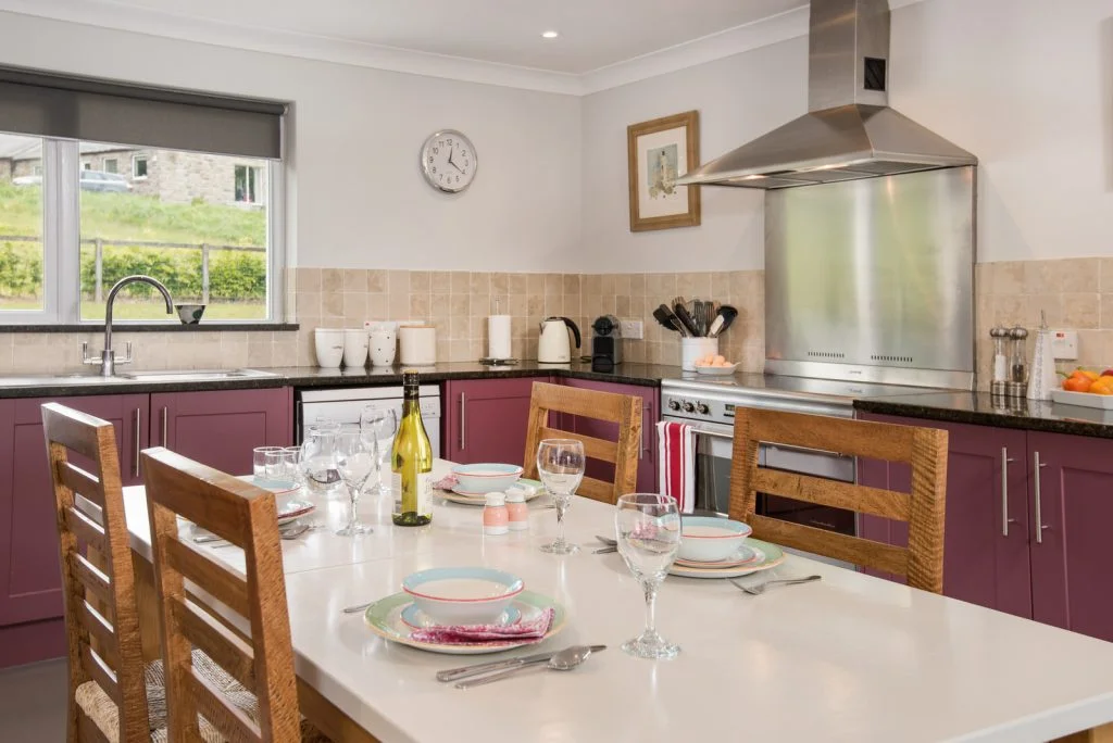 The well equipped kitchen includes granite worktops, a dishwasher, washer dryer, American style fridge freezer, and everything needed for relaxed self catering. The oak dining area provides a warm and sociable space for shared meals.