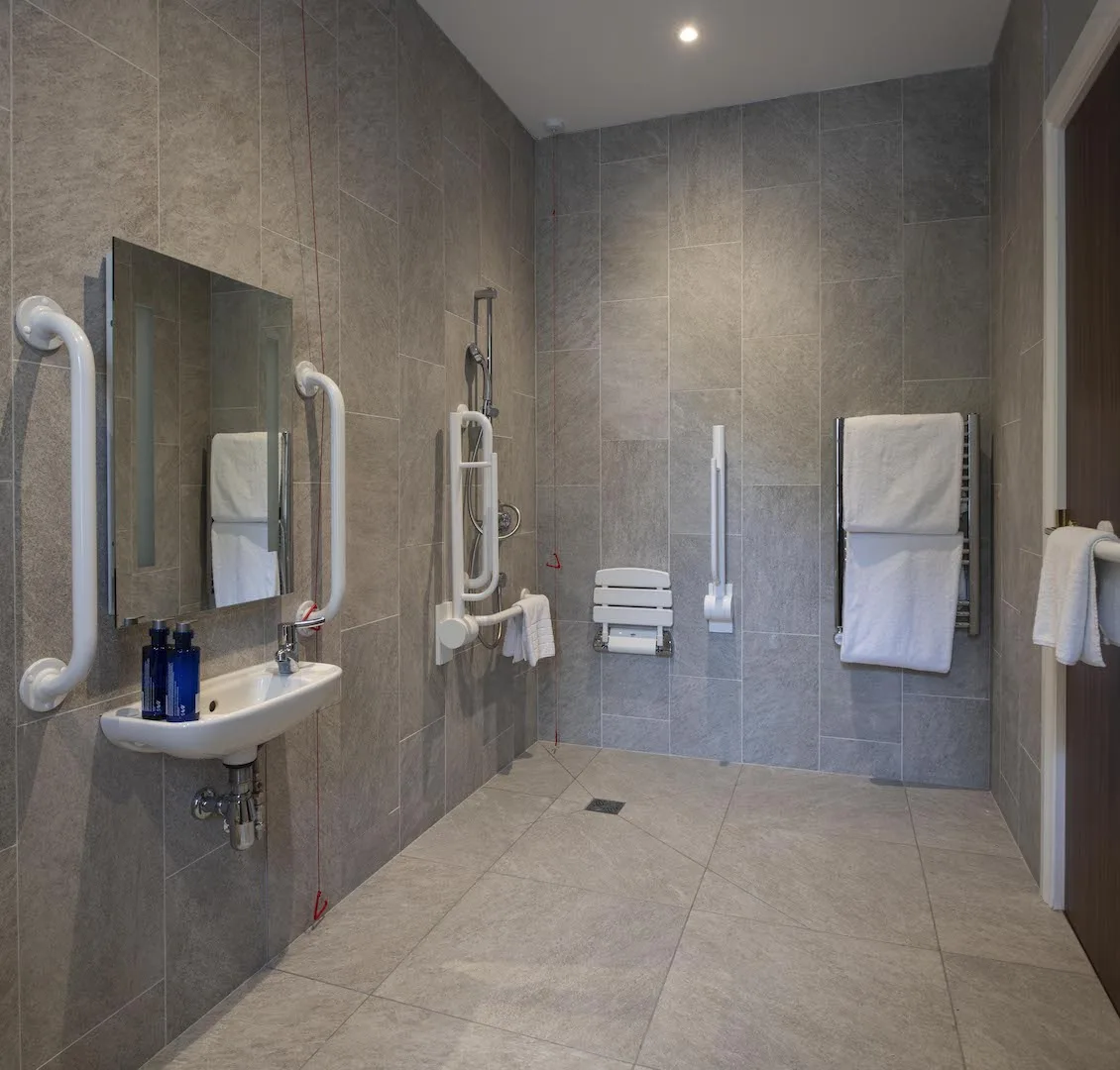 Ness Walk’s commitment to accessibility extends throughout the hotel. Level access is available across all public spaces, and lifts offer audio support for visually impaired guests. The reception area features a hearing loop, ensuring an inclusive experience from the moment you arrive. Accessible public restrooms include emergency pull cords, handrails, and wide entryways. Outside, guests benefit from secure on-site parking with multiple accessible bays and EV charging points, making arrival simple and stress-free. The hotel’s award-winning concierge team is available around the clock to assist with transport arrangements, mobility support, and personalised travel planning.