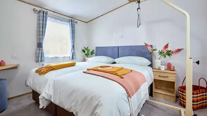 Accommodating up to four guests, the caravan features two well-appointed bedrooms: a twin room and a spacious double bedroom equipped with a mobile trapeze lift handle to support safe and independent movement. The ramped entrance opens into a thoughtfully designed living space with wide, unobstructed pathways and a step-free layout, allowing for easy navigation throughout.