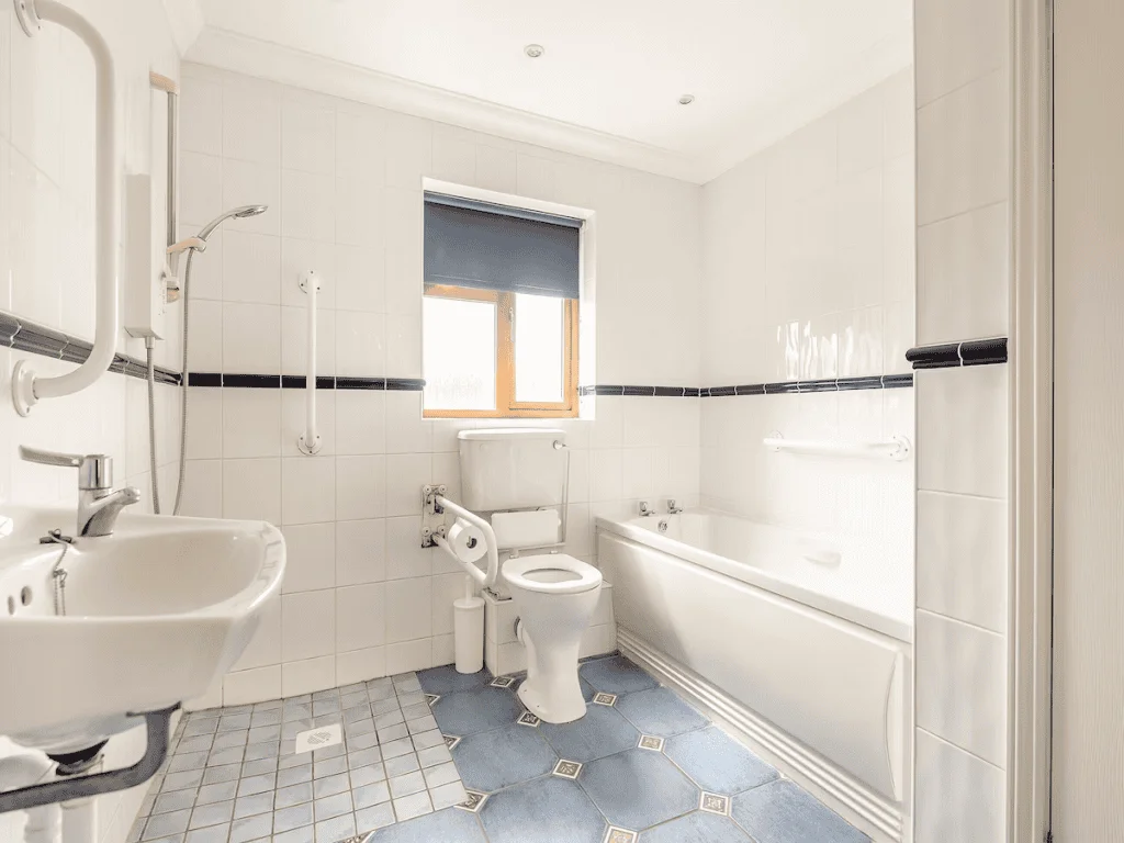 The spacious double bedroom includes a non-profiling bed with clear transfer space to the side, allowing for comfortable navigation using mobility aids. The adjoining accessible wet room is fully equipped with a wheel-in shower, handheld shower attachment, wall-mounted shower seat, wheel-under wash basin, and lever-style taps. Additional safety is provided through handrails positioned beside the toilet, within the shower, and next to the wash basin. A bath with a wall-mounted grab rail offers guests further bathing options.