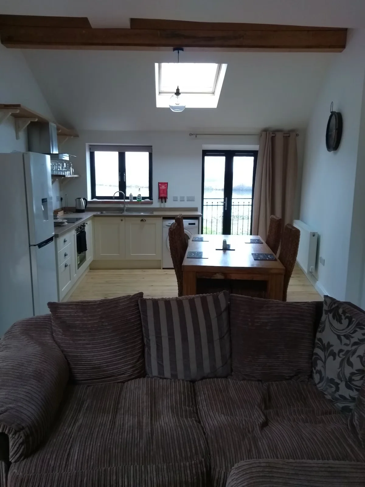 Inside, the spacious living area provides a warm and inviting atmosphere, complete with a comfortable corner sofa, a log burner with a raised surround, and scenic views across the garden. The accessible kitchen includes a low-height oven and amenities that can be easily reached from a seated position, making meal preparation simple for all guests. A dining table with free-standing seating offers flexibility and convenience, with a doorway opening onto the level patio for effortless indoor-outdoor living.