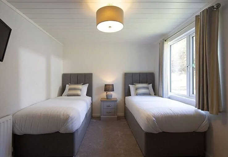 Sleeping up to four guests, the lodge features two inviting bedrooms: a cosy double room with soft linens and warm décor, and a spacious twin room ideal for families or travelling companions. Both bedrooms provide ample storage and a peaceful atmosphere, making them the perfect spaces to unwind after a day exploring Dorset’s beautiful surroundings.