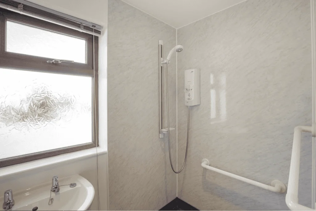 The accessible wet room is thoughtfully designed for ease of movement, featuring a roll-in shower with handheld attachment, a wash basin with lever-style taps, and supportive handrails beside both the toilet and shower.