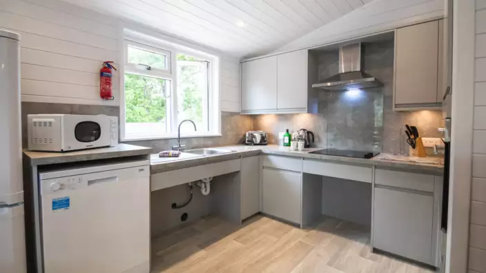 The lodge offers ramped entry for smooth access, with wide corridors and doorways throughout, creating a spacious and easy-to-navigate layout for wheelchair users. The open-plan living, dining, and kitchen area is bright and inviting, allowing for effortless movement while maintaining a homely atmosphere. The fully accessible kitchen includes lowered worktops, a wheel-under oven and sink, and ample space for food preparation, ensuring guests can cook and dine independently.