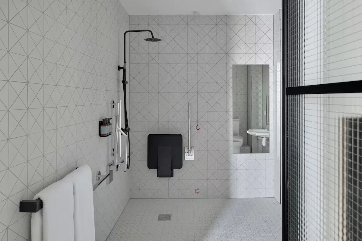 Staycity Dalston has been designed with accessibility at its core. The accessible studio apartments provide a relaxed and functional space for guests with mobility needs, featuring a comfortable double bed, a fully equipped kitchenette, and an en suite wet room with a step free, wheel in shower. Additional features such as supportive handrails, a wall mounted shower seat, and an emergency alarm system offer confidence and convenience throughout the stay.