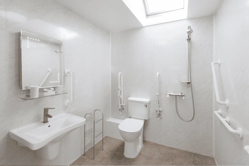 Accessibility continues into the dedicated wet room, designed for comfort and safety. It features a roll-in shower with a handheld attachment, a wash basin with lever-style taps, and well-positioned handrails around both the toilet and shower. Smooth, ramped access to the side decking makes it simple to enjoy the fresh coastal air outdoors.