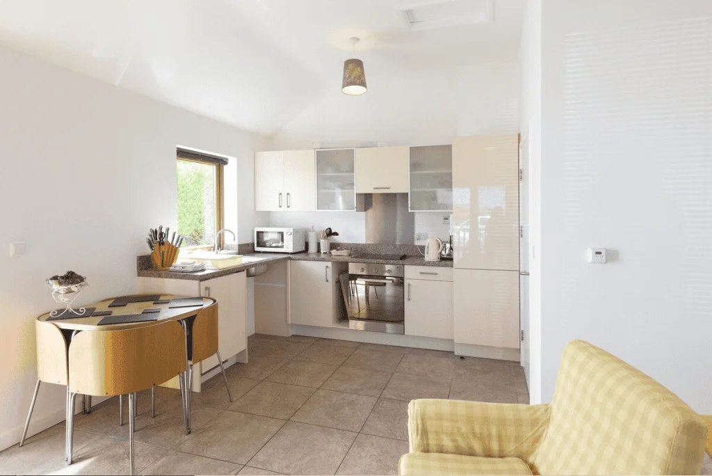 The open-plan layout brings together a cosy living area, comfortable sleeping space, and a well-equipped kitchen into one bright, easy-to-navigate room. The kitchen includes a wheel-under counter and accessible workspaces, allowing guests to prepare meals with ease, while the freestanding dining seating ensures comfort and flexibility. Whether you’re enjoying a quiet breakfast or unwinding after a day by the sea, the space feels warm, practical, and inviting.