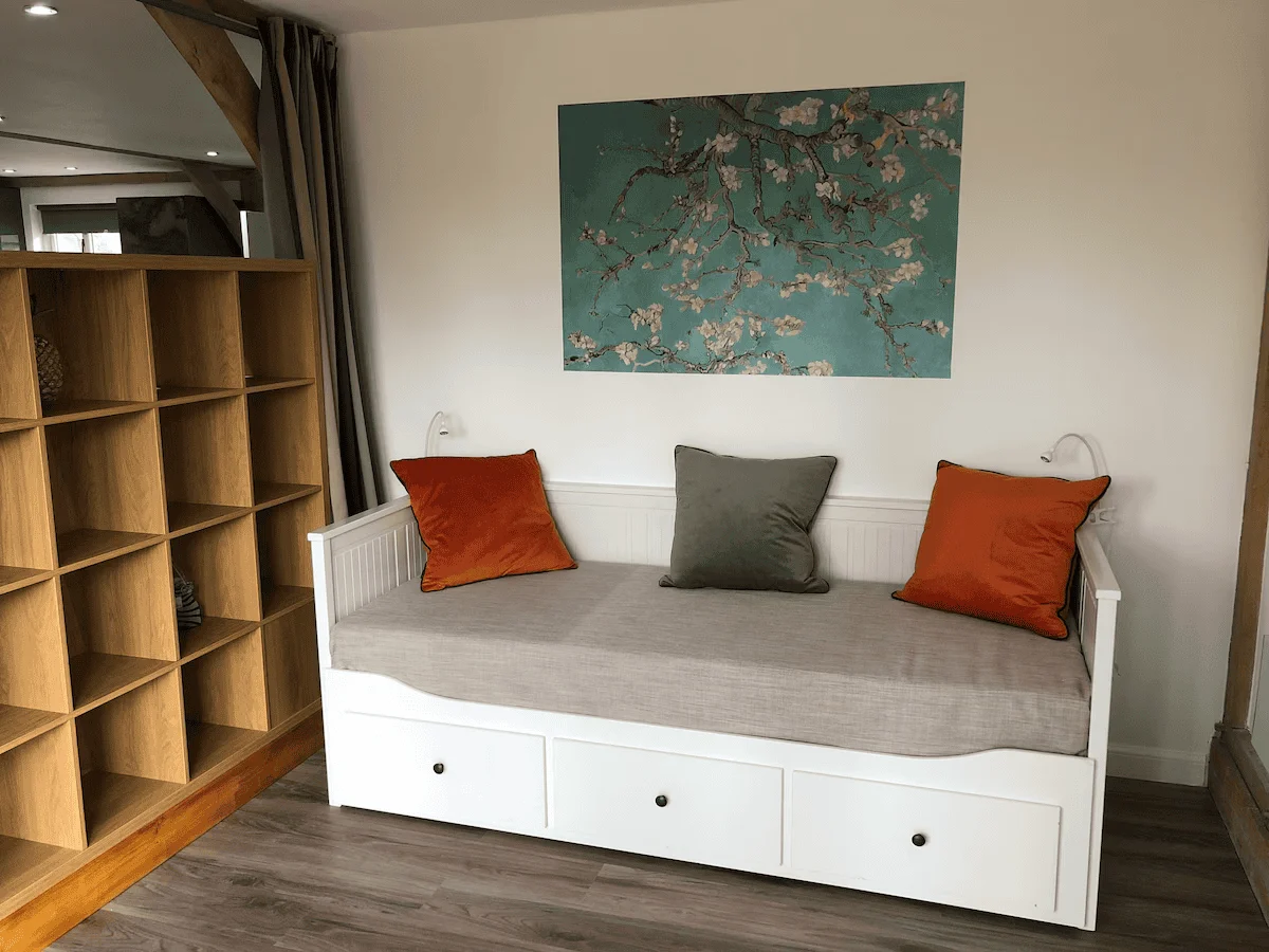 Housed in a striking oak framed building, The Family Barn exudes character from the moment you step inside. Exposed beams, solid wooden posts, and natural textures create an atmosphere that feels cosy and grounded. The open plan layout enhances the sense of space while keeping everything intimate and comfortable, making it easy to unwind after a day spent exploring the estate or venturing further afield. The accommodation sleeps up to six guests, with a private enclosed bedroom featuring a plush king size bed, a versatile curtained sleeping area that can be arranged with either a double or single bed, and an additional sofa bed offering flexibility for families or mixed groups.
