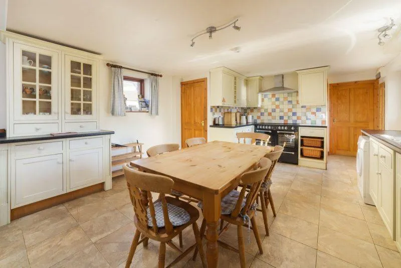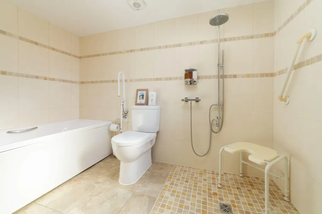 Inside, The Stables combines warmth, practicality, and carefully considered accessibility. The three ensuite bedrooms ensure comfort and privacy for groups or families, with the ground floor bedroom created specifically for guests with mobility needs. This inviting room features a double bed and a fully equipped ensuite wet room designed to support independence and ease. The wet room includes a wheel in shower with a handheld attachment, a shower seat, strong grab rails, and a separate bath with a dropdown handrail to provide assisted access. Level flooring throughout the ground floor creates smooth transitions between rooms, making movement effortless for guests using mobility aids.