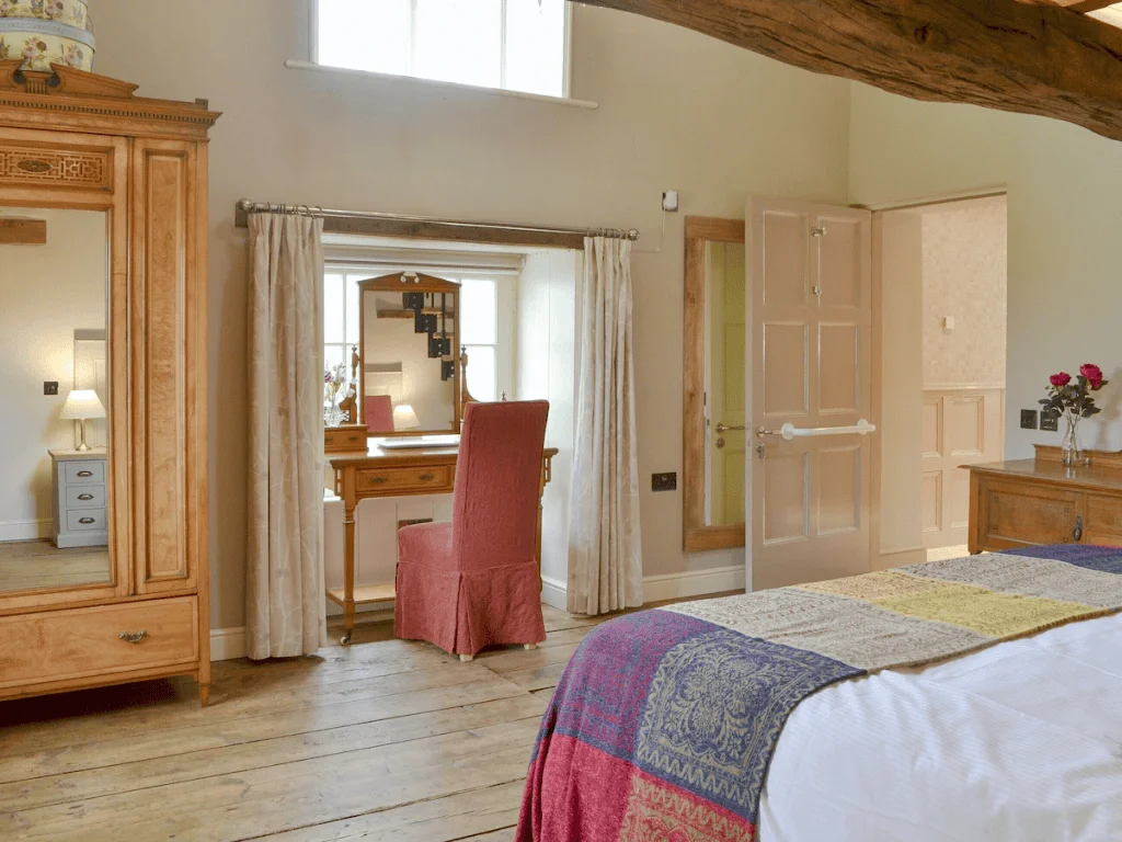 Inside, Westfield Farm feels spacious, elegant, and full of character. The ground floor has been designed with accessibility in mind, offering wheelchair friendly, level access throughout. The large, well equipped kitchen features wheel under counters and accessible workspaces, making meal preparation easy and sociable. The cosy living spaces include a comforting log burner for cosy evenings in, while smart TVs, WiFi, a dishwasher, and a coffee machine ensure modern convenience without compromising the property’s charming character.