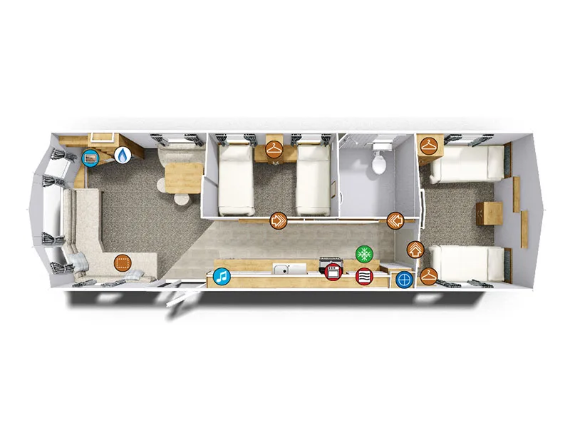 The caravan’s open-plan living and dining area creates a bright, spacious environment perfect for socialising or unwinding. The fully accessible kitchen features lowered worktops, a wheel-under counter, and easy-to-reach appliances, allowing guests to cook and dine comfortably. Both twin bedrooms are designed for convenience and comfort, with the larger room including a mobile trapeze lift handle to assist with turning and transfers. Bed linens, duvets, pillows, and towels are all provided for a seamless and restful stay.