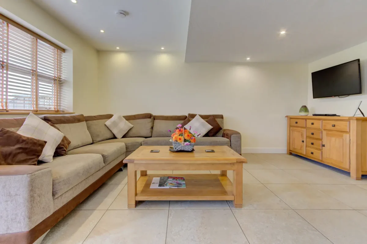 Upon entering, guests are greeted by a warm and open-plan living area that flows seamlessly onto a private patio, perfect for morning coffee or al fresco dining. The ground floor includes two charming bedrooms, each furnished with luxurious pocket sprung beds and stylish en suite bathrooms featuring modern mosaics and invigorating showers.