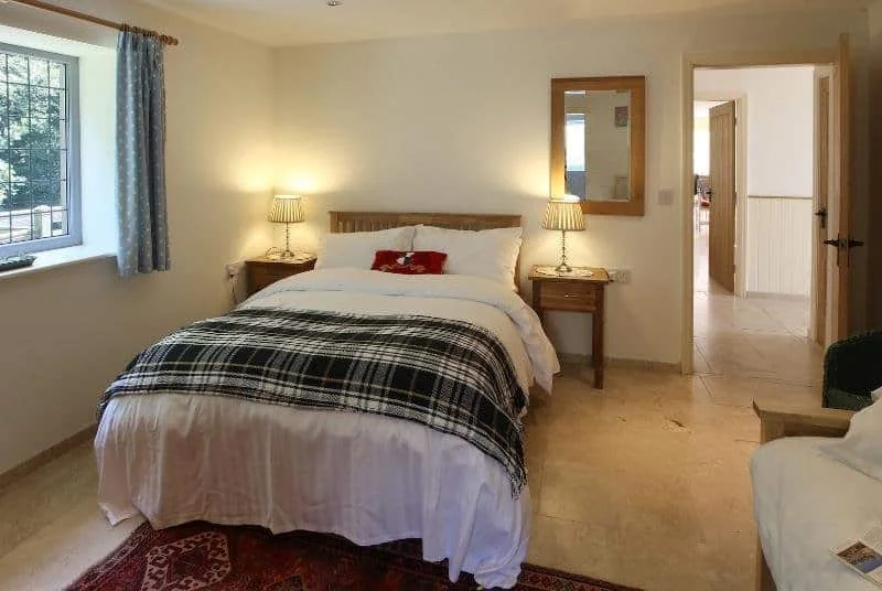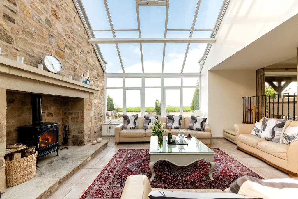The expansive open plan living area is the social heart of the cottage. A designer kitchen, complete with an AGA, wine cooler, and generous preparation space, makes cooking a pleasure, while the large dining table seating over sixteen guests is perfect for shared meals, celebrations, and family gatherings. The lounge area provides a cosy place to unwind, with a fireplace, wood burning stove, plush seating, and entertainment options including Sky TV, a DVD player, and a CD player. For quieter moments, the bright conservatory and garden room offer a peaceful space to relax while enjoying views of the surrounding countryside. Underfloor and central heating ensure the property remains warm and inviting throughout the year.